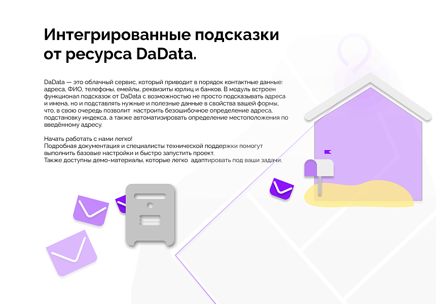 DaData — это облачный сервис, который приводит в порядок контактные данные: адреса, ФИО, телефоны, емейлы, реквизиты юрлиц и банков. В модуль встроен функционал подсказок от DaData с возможностью не просто подсказывать адреса и имена, но и подставлять нужные и полезные данные в свойства вашей формы, что, в свою очередь позволит настроить безошибочное определение адреса, подстановку индекса, а также автоматизировать определение местоположения по введённому адресу.