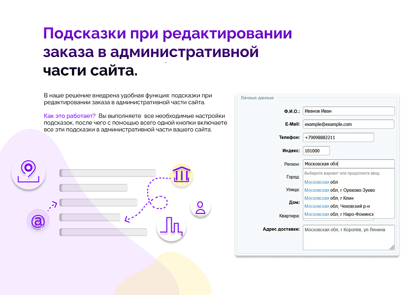 Модуль “Подсказки и автозаполнение от DaData (КЛАДР)” – это интегрированные подсказки от ресурса DaData.