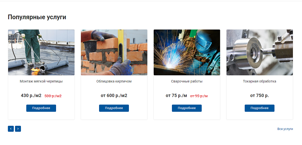 Перелинковка. Широкая перелинковка за счет вывода пагинации в виде раскрытого списка на разделы и подразделы, а также вывода популярных товаров на детальных страницах услуг и каталога.