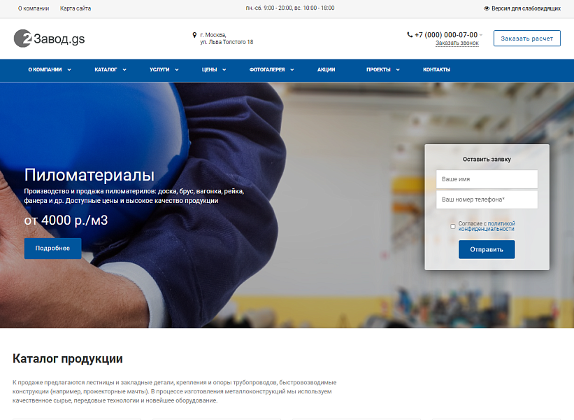 Завод.GS - 2.0 сайт производственной компании – современный универсальный сайт для компаний и индивидуальных предпринимателей. Возможная интеграция: строительные материалы, продажа кирпича, продажа газобетона, производство и продажа бетона, изготовление заборов и ограждений, инженерные коммуникации,, системы отопления, электрика, водоснабжения, вентиляции, канализации, металлоконструкции, металлоизделия, металлопрокат, пиломатериалы, продажа техники и оборудования, строительство, ремонт, производственная фирма, интернет-магазин строительных материалов